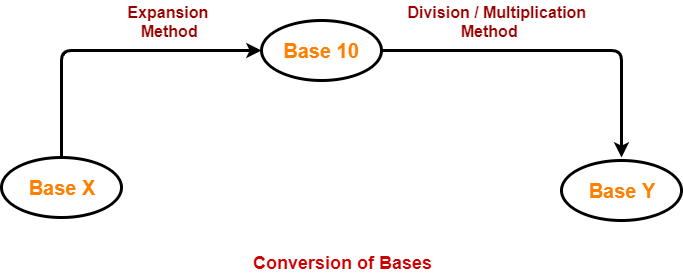 Conversion of Bases- To convert a number from any base to any other base, it is first converted to base 10 using expansion method and then it is converted from base 10 to required base using division & multiplication method.