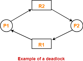 - Process P1 holds resource R1 and waits for resource R2 which is held by process P2.