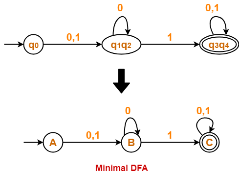 • The equivalent states are merged to form a single state in the minimal DFA.