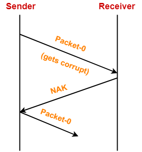 - If receiver receives a corrupted data packet from the sender, it sends a negative acknowledgement (NAK) to the sender.