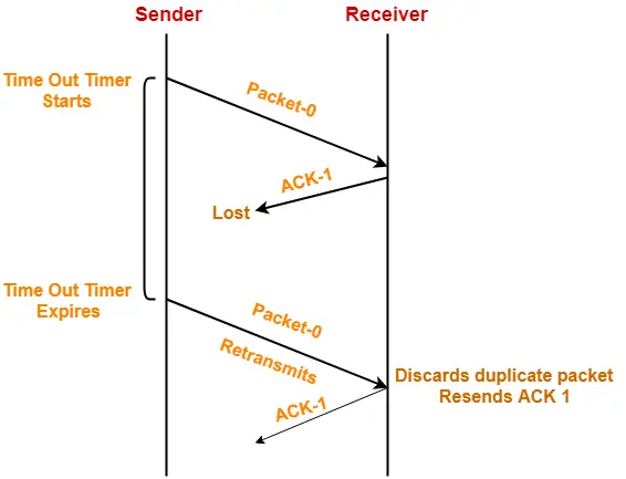 - Receiver discards the duplicate packet and re-sends the same acknowledgement.
