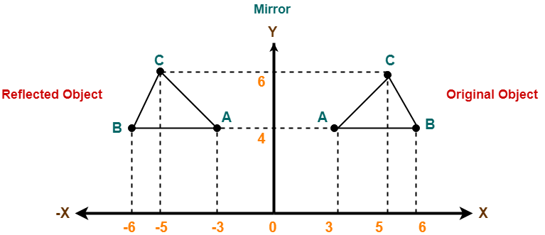 Given a triangle with coordinate points A(3, 4), B(6, 4), C(5, 6). Apply the reflection on the Y axis and obtain the new coordinates of the object.