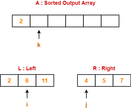 • Since L[1] > R[0], so we perform A[1] = R[0] i.e. we copy the first element from right sub array to our sorted output array.