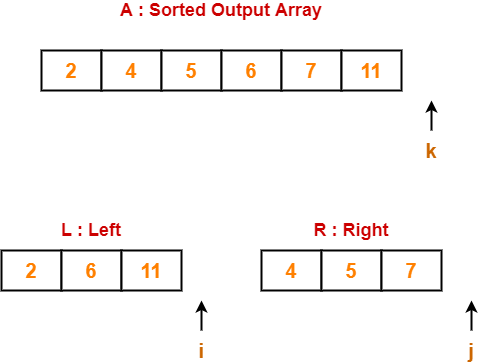 • Clearly, all the elements from right sub array have been added to the sorted output array.