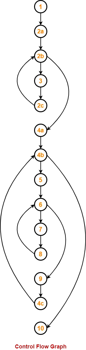 Using the above control flow graph, the cyclomatic complexity may be calculated as-